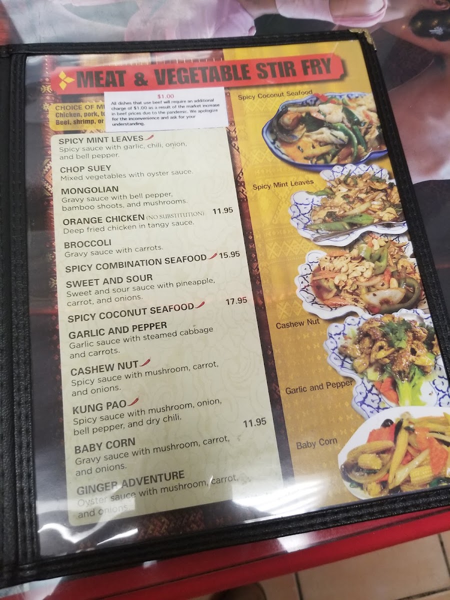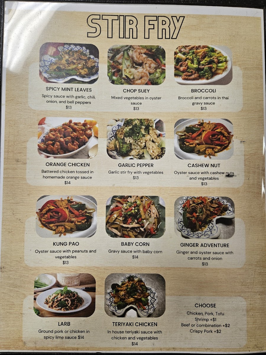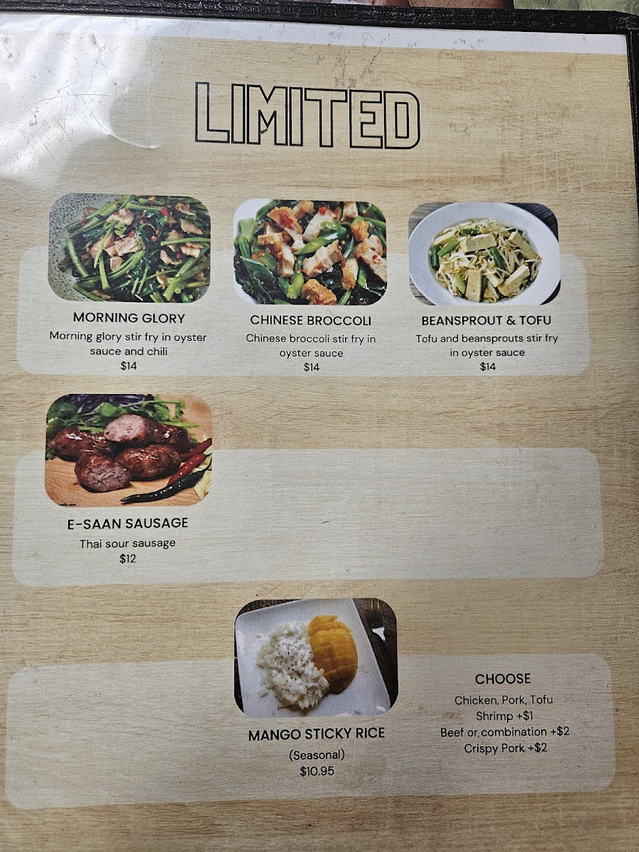 Chinese broccoli served with choice of morning glory and mixed with either chicken, pork, shrimp, beef, tofu, vegetables, or crispy pork.
